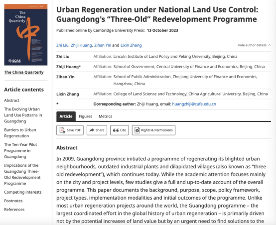 近日,以我校best365网页版登录黄志基副教授为通讯作者的学术论文“Urban Regeneration under National Land Use Control: Guangdong's ‘Three-Old’ Redevelopment Programme”在区域与中国研究国际权威期刊The China Quarterly(中财AAA类)在线发表。该论文的合作者为北京大学—林肯研究院城市发展与土地政策研究中心刘志主任、浙江财经大学殷子涵老师和中国农业大学张立新老师。论文在线链接如下:https://doi.org/10.1017/S0305741023001455。
