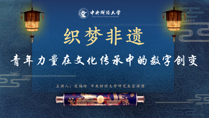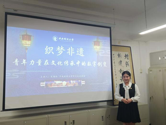 接着,我校研究生宣讲团执行团长皮福玲以“织梦非遗:青春力量在文化传承中的数字创变”进行宣讲。她基于党的二十届三中全会聚焦社会主义文化强国建设背景,说明了非物质文化遗产是中华优秀传统文化的重要组成部分。她还通过列举非遗活态化传承在数字空间发酵出圈的案例,阐述了数智技术是文化领域新质生产力的重要支撑,且让非遗在新时代焕发新生命。