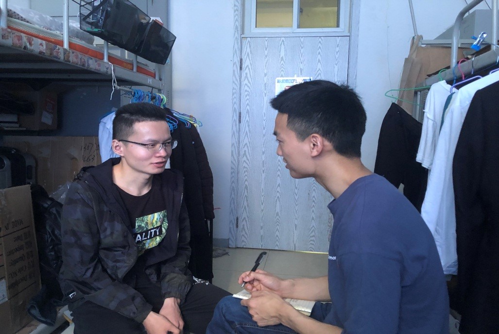 图为行管党小组组长田飞和徐林谈心