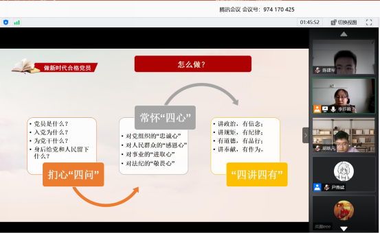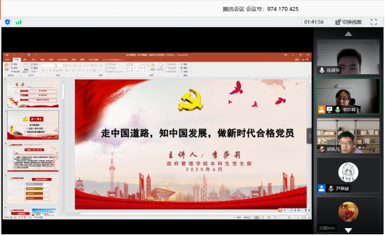 为深入贯彻《关于开展庆祝中国共产党建党99周年主题教育活动的通知》文件精神,做好基层“庆祝建党99周年、迎接建党100周年”主题教育活动。best365网页版登录本科生党支部于2020年6月15日使用腾讯会议平台开展线上主题党日活动。best365网页版登录本科生党支部书记李莎莉老师及党支部全体党员参与活动。