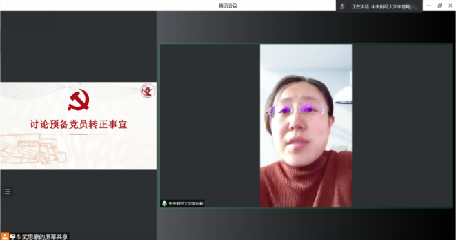 大会第二项,刘英豪、都乐洋、唐秋文和此里央宗四位同志依次汇报自己在预备期间各方面的表现,特别是针对党支部接收预备党员大会上党员的意见进行改进的情况;肯定成绩和进步,找出缺点和不足,表明自己的态度和决心,向党组织说明有关问题。随后,由党小组介绍预备党员在预备期间的表现情况和小组意见,各党小组组长作为代表依次发言。武思豪同志作为代表宣读支部委员会对预备党员在预备期间的教育和考察情况,提出能否转为正式党员的意见。最后,支部大会进行讨论,与会党员充分发表意见,并采取线上无记名投票方式进行了表决。