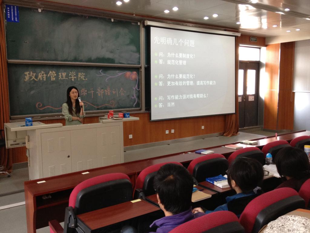 随后,柳月同学为与会学生干部讲解了提高写作能力的方法。首先,柳月同学强调了写作能力对于学院学生工作规范的开展以及对学生干部个人发展的重要意义,并介绍了一个有效的写作方法,即“明确写作目标—搭建写作框架—填充支持性内容”。她还分享了“模仿练习”这一提高写作能力的实用途径,同时强调了不断练习、熟能生巧的重要性。
