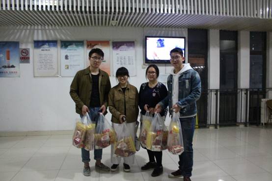 晚上七点半,宁老师和杨崇祺将各类零食分别装入准备好的袋子中,包括小面包、小饼干等,二十五个袋子分堆地摆放在办公室中,代表了学院对献血同学们的鼓励赞扬和关心爱护。八点半,宁老师、阙老师与杨崇祺学长分别提起装满慰问品的袋子,往学生宿舍楼走去。