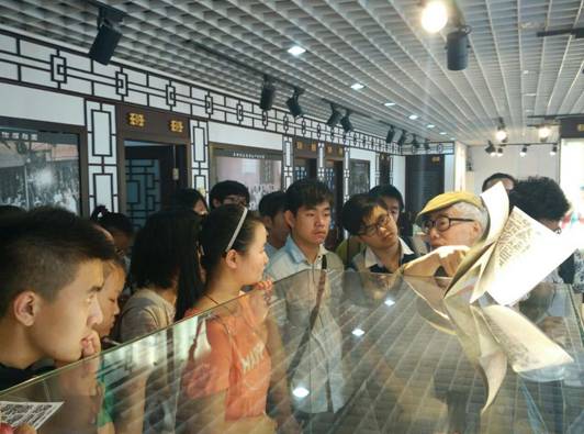 调研开始后,袁先生首先带领我们来到位于前门大街黄金分割比例处的老字号——天津盛锡福三楼的中国冠帽文化博物馆进行参观。袁先生向大家介绍了前门与大栅栏的历史发展及有关盛锡福老字号的流传——三顶帽子见证百年历史,他还拿出自己标注的古代-近代-现代北京市商业空间分布及演化图与大家共享,向同学们介绍了北京的商业空间的时空演化格局。袁先生几十年用心行走在北京的胡同、街道中,他对老北京文化有着独到的见解,他的讲述有趣新颖,同学们都痴迷于其中,折服于先生无穷的学术研究与个人魅力。之后,同学们有幸占据了制高点——盛锡福三楼,一览整条前门大街的景观。
