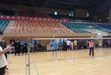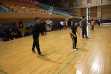本次比赛分为小组赛和淘汰赛。在小组赛对阵中国社科院研究生院的比赛中,五组队员(第一男双、第二男双、第一混双、第二混双、女双)技术纯熟,发挥稳定。第一男双于鹏、王伟老师以身高优势力克强敌,第二男双毕鹏程和梁力兮师生组合,以灵活和技巧取胜,最终我院与社科院携手顺利进入八强。在八强淘汰赛中,我院遭遇中国人民大学队,尽管我院依旧靠着稳定的发挥与对手僵持,但不幸败北。在对阵中,女双组合徐淼、王红梅老师发挥出色,平抽快挡、跳起杀球,动作精彩赢得了现场观众的阵阵掌声,也得到了对方球友的大力赞赏。
