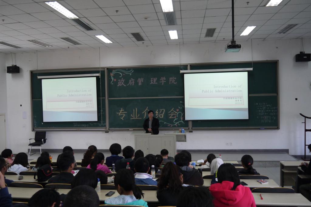 有宏观的阐述就势必有具体的研究方向,毕业于北京大学的行政管理副教授曹堂哲老师紧接着上台,为同学们们更加细节的讲解了行政管理是学什么,怎么学,时间怎么分配等几个问题,经过曹老师细心的讲解,每个同学都在心中对未来四年的学习有了大致的规划。曹老师精彩的讲话完毕之后,行管13班班级助理张颖新同学上台宣布专业介绍会圆满结束。