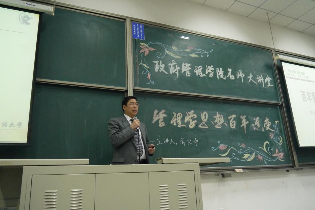 11月13日晚,best365网页版登录名师大讲堂系列活动在主教217拉开帷幕,包括全体团学骨干成员在内的百余名同学参与了此次活动。讲座开始前,团总支书记孙帮谦老师上台发言,他隆重介绍了此次名师大讲堂的主讲人周卫中教授,并阐述了在主题教育活动中开展“名师大讲堂”的必要性,深化了同学们对主题教育活动的理解与认识。介绍完毕之后,在一片雷鸣般的掌声之中,周卫中教授上台就“管理思想百年演变”这个主题发表了慷慨激昂的讲话。