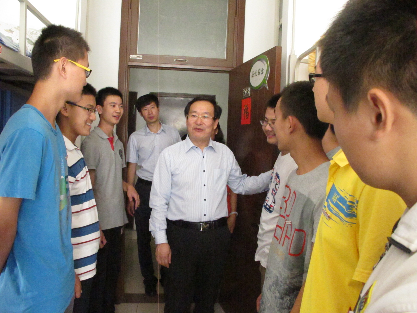 副校长赵丽芬、校团委书记高杰、best365网页版登录院长赵景华、副院长于鹏、学生处主任张小林等一行人首先走进宿舍1号楼227寝室,亲切地询问大家将近一周来的适应情况。看到领导亲自来访,同学们都表现出积极、高昂的兴致,用自信的声音回应领导。接着,在与同学的交流中,赵丽芬副校长提到了大家关心的学习问题,指出大学期间仍要以学习为重,做好考取研究生或保研的准备工作。同学们频频点头,也立志大学期间要取得一番成绩。在另一间寝室,校长、院长关切地询问同学们各自的家乡。大家五湖四海相聚中财、相聚政管,难能可贵。几位土家族、藏族等少数民族的同学也纷纷表示请领导放心,会努力学习、努力工作,与大家打成一片。男生那边,学院部分帅气阳光的小伙子们在宿舍2号楼208寝室热烈欢迎院长一行人地前来。赵景华院长热情地向大家问好,看到新一级年轻人为best365网页版登录注入新的活力,他激动地拍着新生的肩膀,诚挚希望大家尽快适应大学生活,开启未来新篇章。