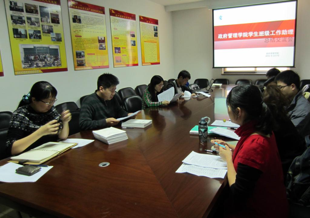 随后,各位班级工作助理依次发言,介绍了所带班级的整体情况及重点关注学生的情况,还就自己的工作特色、工作方法以及在工作中发现的问题和建议进行了总结。其中,08国政班班级工作助理赵艳从提到,班级工作助理的定位是关键,同时建议各位班级工作助理将自己的经验整理出来汇编成册,以便经验分享。09国政班班级工作助理张爽分享了他的三点经验:第一是从细微处发现学生的需求;第二是培养学生主动寻求帮助的能力;第三是既要关注共性问题,也要关注到学生的个性问题,有针对性地调整工作方式。10行政管理班班级工作助理杨柳以“发现、交流、互助、成长”为主题作了精彩的发言,全面介绍了她的工作方式,本学期设立“谈心坊”的工作计划得到了各位班级工作助理的赞赏。11公管1班班级工作助理周琦玮则分享了她“信任为重、倾听为主”的工作方式,介绍了她新学期“四个一”的工作目标,即“进行一次职业生涯规划班会、参与一次班级活动、进行一次考前辅导、每个同学一次一对一交流”。11公管2班班级工作助理王丽龄则重点介绍了她与班主任老师及班委密切合作的工作方式,成立班级兴趣小组的创意受到了与会老师的表扬。担任过3年班级工作助理的11国政班工作助理孙海龙则通过工作中遇到的具体问题,如专业困惑、课业压力等,分享了他对班级工作助理工作的理解以及他的工作特点。