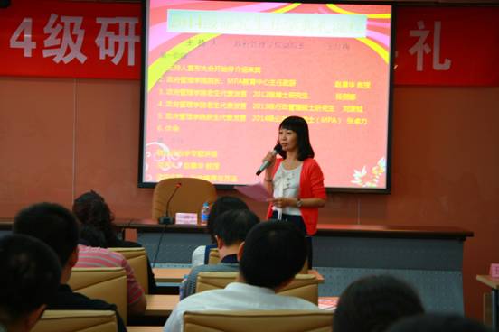 2012级博士研究生段丽娜、2013级行政管理研究生刘潇钺作为老生代表发言。作为学院第一位完成全日制MPA学业之后考取博士的研究生,段丽娜从自身考取博士和在此期间竞聘上北京市财政局副处级领导岗位的经历谈起,号召同学们在未来两年的学习中要登高望远,在学习中不断提升自己的境界;要做到学以精专,学以致用,理论与实践相结合,更重要的是要勿忘初心,这样方得始终。刘潇钺鼓励新同学在政管这个温馨的大家庭中要注重思考,端正态度,培养兴趣,增强能力,共同为自我发展和学院建设而努力。2014级公共管理硕士(MPA)张卓力同学作为新生代表发言,他表示,通过复习考试,重拾书本,他得到了之前难以想象的收获。他号召大家,要珍惜未来宝贵的两年时光,摆正姿态,潜心为学,最大限度地吸取知识和营养,为未来的发展奠定更加牢固的基础。