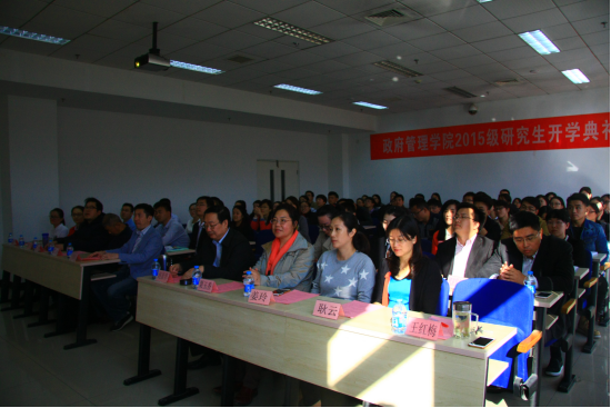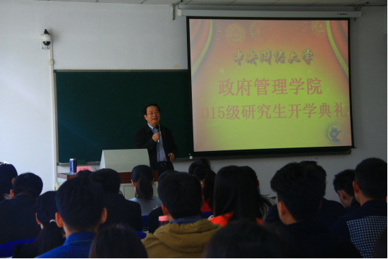 2014级博士研究生冯剑、2014级MPA硕士研究生宋航作为老生代表发言。来自北京市政府外事办公室的2014级冯剑博士以自身在职学习的切身经历向新生介绍了宝贵经验,他深知学习艰苦,时间紧张,他告诫大家要提高学习管理能力的水平,平衡工作-学习-家庭三者的关系,切忌死读书、读死书,要学会学以致用,发言的最后冯博士呼吁大家要传承发展“中央政府”正气浩然、上善若水的学院精神。来自北京市地方税务局系统团委的14级MPA硕士研究生宋航用忘不了、忙不完和爱不够三句话形容了研一一年的生活,诗情画意地感叹了时光飞逝,年华易老。发言的最后他赋诗一首:常忆寒窗渐故;欲返难寻归处;齐聚皂君庙;终添扬帆罗布;上路,上路;青春与君同步!以此鼓励新同学一定要把握机会,珍惜重返校园学习的机会。2015级行政管理硕士研究生刘曼同学作为新生代表发言,她坦言第一次踏入中央财经大学的校门便对中财产生了崇高敬意,表达了对未来研究生生活的无比期待。