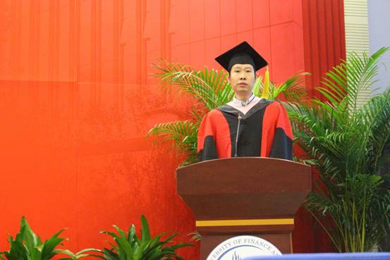 2017届本科毕业生代表行政管理班郑舒文与2017届研究生代表学术型硕士班孙帮谦相继发言。郑舒文同学深情讲述了自己的中财梦,她表示,父母的殷殷期盼与老师的谆谆教诲让同学们在生活学习中学会了协同合作,懂得了感恩与奋斗。郑舒文同学在畅谈自己在政管学院的成长感悟时,深情回顾了大学四年的点滴与感动。回望四年中财生活的泪水与欢笑,她对同学的陪伴与帮助表达了感激;她这四年求学历程的艰辛与收获,反映了认真做学问、踏实搞研究的严谨学术态度,展现了政管毕业生勇担使命、奋发上进的优秀精神风貌。天长等世事,化云烟,有一种情怀,叫做眷恋;地久待沧海,变桑田,有一种梦想,叫坚守。无论未来身处怎样的环境,政管毕业生都致力于成为“具有强烈社会责任感和卓越领导力的创新型公共管理人才”。孙帮谦同学幽默的话语和诙谐的语气活跃了典礼的气氛。作为“中央政府”的“老人”,回望两年的研究生生涯,他感慨万千。从带着些许青涩怀揣梦想齐聚“中央政府”开始,更好地做梦,更好地做研究,更好地做人,更好地做事就成了他们最好的勉励。孙帮谦同学随后表达了自己的感激之情,感激中央政府老师们无限的理解和包容,感激同学们共同扶持,共同成长的陪伴。“中央政府”有同学们美好的青春年华,“中央政府”也让同学们的梦想开始发芽。分别,亦是开始。新的征程中,同学们会牢记肩负的使命,不忘初心,继续砥砺前行!