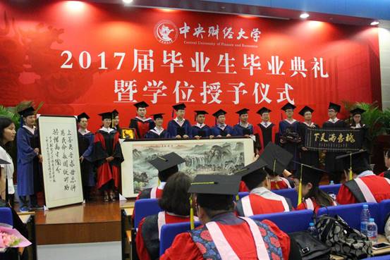 首先,在同学们热烈的掌声中,全体老师入场。随后,师生共同观看“青春政好,永不散场”毕业纪念视频,视频以“花季·雨季·彩虹”为线索,记录了2017届毕业生的学习感悟、生活点滴,诉说了中财学子对未来的展望与憧憬,同时也饱含了对母校与学院的眷恋和祝福,深深感染了在场的每一位同学。全体师生起立奏唱国歌,本次毕业典礼学位授予仪式正式开始。副院长姜玲老师宣读《关于2017届本科生毕业及授予学士学位的决定》和《关于2017届研究生毕业及授予学位的决定》,院党委书记吕丽宣读《关于表彰2017届本科优秀毕业生的通知》及《关于表彰2017届优秀毕业研究生的通知》。赵景华院长、姜玲副院长、院党委副书记白云真为优秀本科毕业生及优秀研究生毕业生颁发荣誉证书并与同学们合影留念。