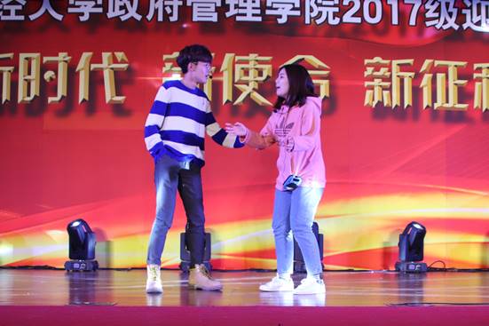 接下来进入十九大知识问答环节。“新时代、新使命、新征程”,政管学子“不忘初心、牢记使命”,在党的十九大圆满召开后,我院老师、学生都深入贯彻学习十九大精神。在这个环节,同学们热情高涨,踊跃参与,2017级本科生研究生、公管17-2班班主任罗海元老师上台回答“十九大知识”,台下也积极响应,气氛热烈。贯彻学习十九大精神,政管师生在路上。