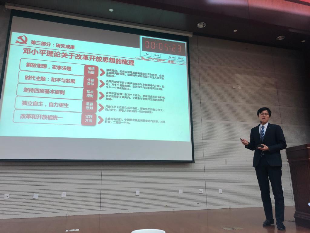 第一组以“新时代改革开放的历史性和时代性”为主题,立足于改革开放四十周年中国社会的变迁,结合习近平新时代中国特色社会主义思想,提出对现阶段我国改革的初步思索,创造性地提出了三个“进一步”思想——进一步让人们共享改革开放成果、进一步解放思想、进一步深化改革。随后,第一小组以“一带一路”对外战略为研究框架,展示了空间视角下一带一路对国内经济发展的深远影响。