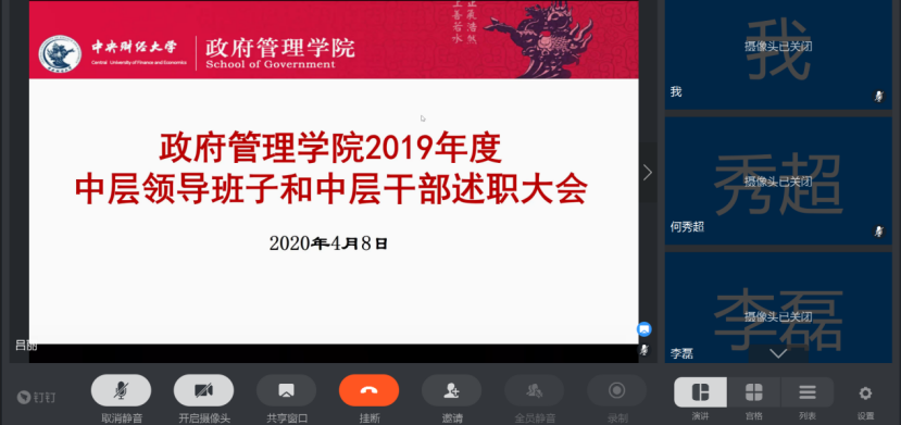 2020年4月8日,best365网页版登录通过钉钉视频会议召开线上2019年度中层领导班子和中层干部述职大会。校党委书记何秀超出席会议,学院领导班子成员及全体教职工参加会议。会议由学院党委书记吕丽主持。