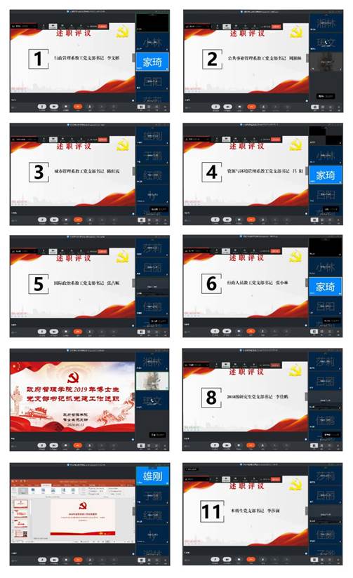 会议上,共有10位党支部书记进行线上述职汇报,1位党支部书记进行书面述职。各位党支部书记围绕学习贯彻落实习近平新时代中国特色社会主义思想、党的十九大精神和十九届四中全会精神、切实开展“不忘初心、牢记使命”主题教育、推进“两学一做”学习教育常态化制度化、贯彻全国教育工作会议和各级思想政治工作会议精神、抓党建促进支部建设等方面,重点介绍了自己在2019年的履职情况,展示了支部党建工作开展的特色做法和亮点,同时对支部党建工作存在的工作难点和问题进行了阐述,提出了进一步加强基层党组织建设的思路和措施。与会人员普遍反映,深入学习贯彻党的十九大精神系列活动和“不忘初心、牢记使命”主题教育切实增强了我院师生党员的“四个意识”,坚定“四个自信”,做到“两个维护”,锻炼并提升了各党支部书记的能力水平,但同时与会人员也反映理论学习有待于深入,党建工作创新性有待于提高,支部建设与“双一流”建设结合有待于加强等切实存在的问题。